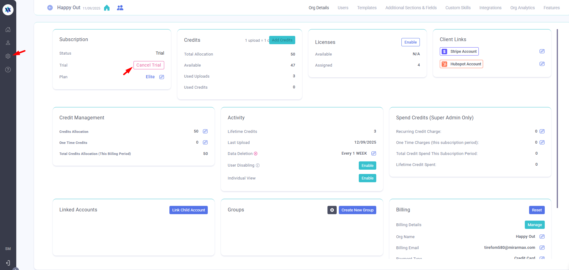 The user with organisation admin permissions should navigate to settings and on the Org Details page, click the "Cancel Trial" button.