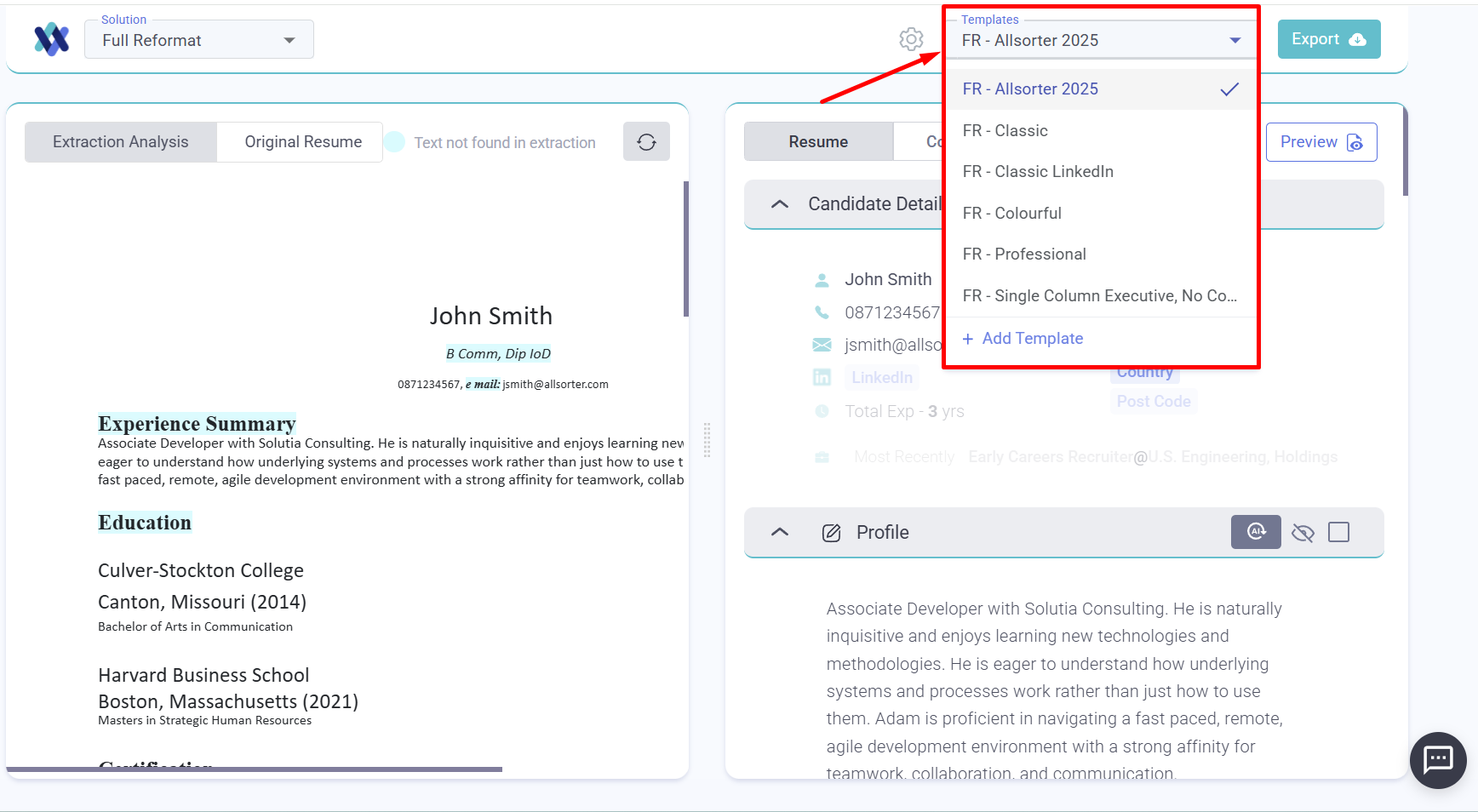 You will find the available Full Reformat (FR) templates in the top righthand corner of your screen when you are using the Full Reformat solution. Choose the one you need to use, edit, preview and export.