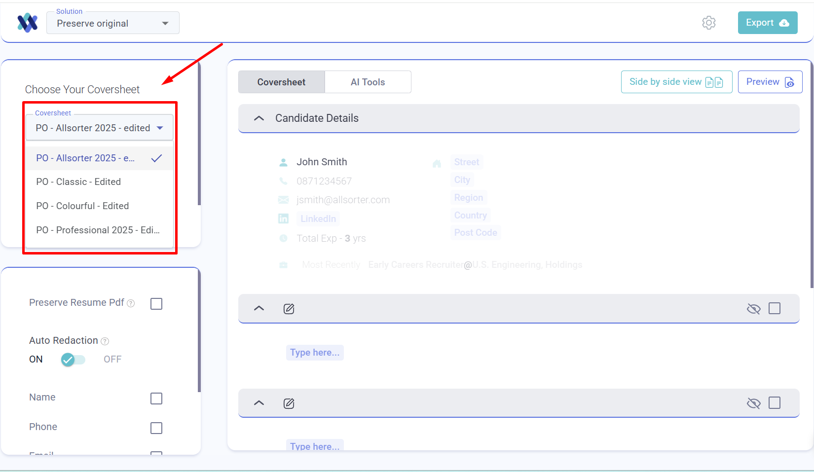 The list of available Preserve Original (PO) templates or coversheets can be found in the left dropdown menu in the Preserve Original solution. Choose the one you need to use, edit, preview and export.